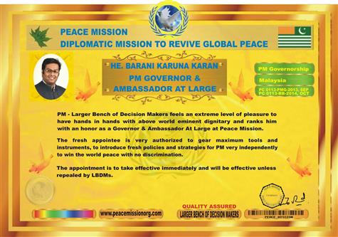 CONGRATULATIONSPROF DATO’ DR.BARANI KARUNAKARAN ON HIS APPOINTMENT AS PEACE MISSION GOVERNOR AMBASSADOR AT LARGE (M.